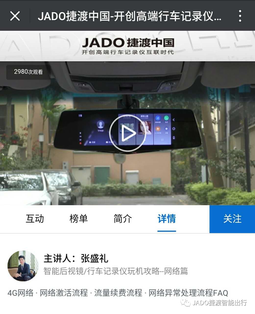 直播中,張盛禮先生就網(wǎng)絡(luò)注冊(cè)激活流程進(jìn)行現(xiàn)場(chǎng)演示,使觀眾仿佛置身現(xiàn)場(chǎng),對(duì)于JADO智能行車記錄儀的使用一目了然,更加得心應(yīng)手。同時(shí)也針對(duì)使用中可能出現(xiàn)的微信公眾號(hào)二維碼加載失敗或者網(wǎng)絡(luò)異常的問(wèn)題,進(jìn)行措施處理的講解。