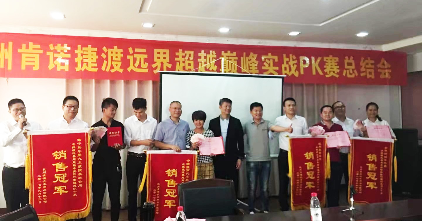 2017年9月12日,杭州肯諾汽車用品有限公司攜手JADO捷渡智能(中國),舉行了“捷渡英雄聚,肯諾創(chuàng)共贏”浙江遠界團隊超越巔峰實戰(zhàn)訓練營PK賽總結(jié)大會。JADO捷渡智能(中國)華東戰(zhàn)區(qū)總監(jiān)杜新先生、杭州肯諾汽車用品有限公司總經(jīng)理徐善振先生,以及各優(yōu)秀終端門店店長參加了本次總結(jié)會。