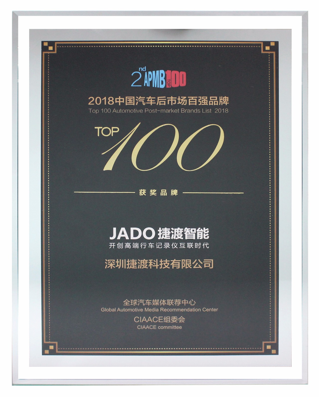 2018年6月21日,由雅森國際攜手中國汽車工業(yè)協(xié)會、中國對外貿(mào)易廣州展覽總公司,以及全球權(quán)威發(fā)榜機(jī)構(gòu)共同發(fā)起的《2018第二屆汽車后市場百強(qiáng)品牌榜》評選結(jié)果重磅出爐,國內(nèi)領(lǐng)先的高端行車記錄儀品牌JADO捷渡智能(中國),憑借多樣化的產(chǎn)品和創(chuàng)新的技術(shù),強(qiáng)勢登榜!與3M、奇虎360、統(tǒng)一等汽車后市場領(lǐng)域知名企業(yè)同期列入百強(qiáng)榜單,這也是業(yè)界對JADO捷渡智能(中國)在行業(yè)地位、創(chuàng)新性、成長性、發(fā)展?jié)摿Φ确矫娴母叨日J(rèn)可。
