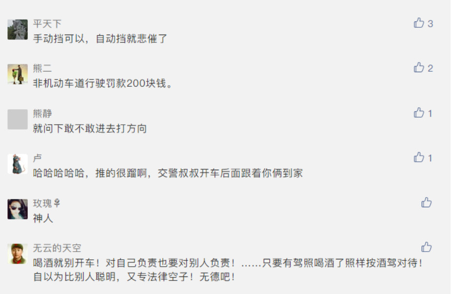 小酒怡情大飲傷身,在路面上推車,有一定的交通安全隱患,后方行駛的車輛對這些人會產(chǎn)生安全威脅。小編提醒,為避免酒后駕車,還是應(yīng)該將車放置到安全地點,或者找熟人代駕,一定要為自己的安全著想!