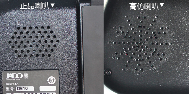 4、 看喇叭孔:正品捷渡 D610 是規(guī)矩的六角形;高仿 D610 日喇叭孔,是放射的"米"字形,也比正品捷渡 D610 花哨點(diǎn)。讓圖說(shuō)話: